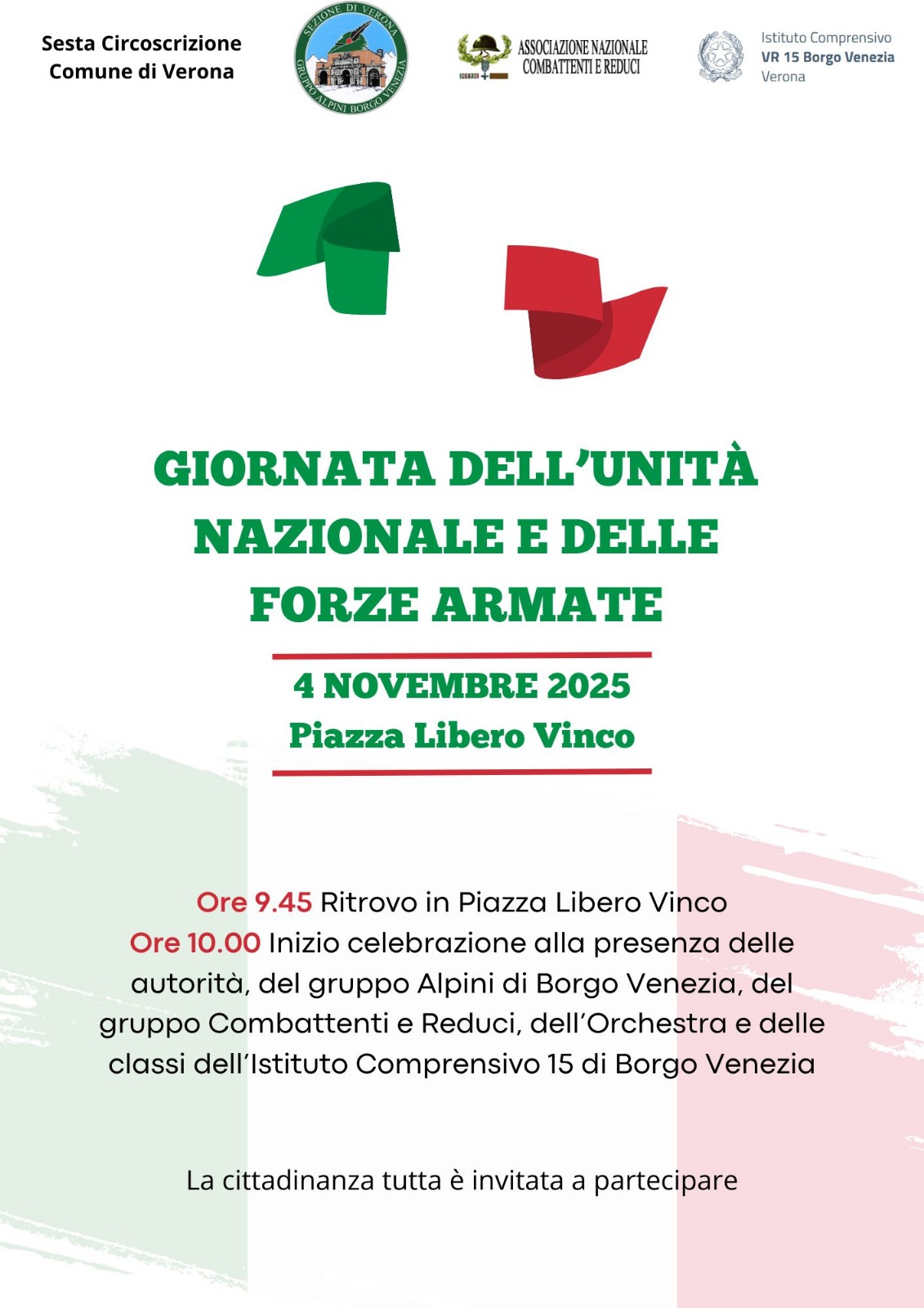 Martedì 4 novembre 2025 alle ore 10 i nostri alunni dell’Orchestra Fincato-Rosani e delle classi quinte del plesso Forti si recheranno in piazza Libero Vinco per la manifestazione del 4 novembre (Giorno dell’Unità Nazionale e delle Forze Armate) organizzata dalla Sesta Circoscrizione e dal Gruppo Alpini Borgo Venezia.