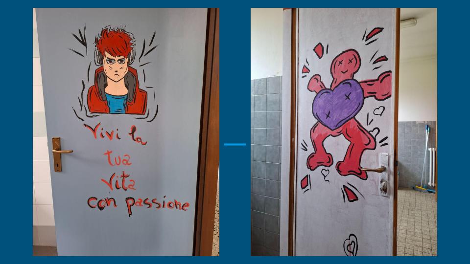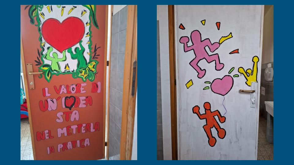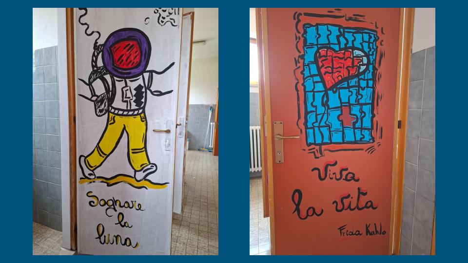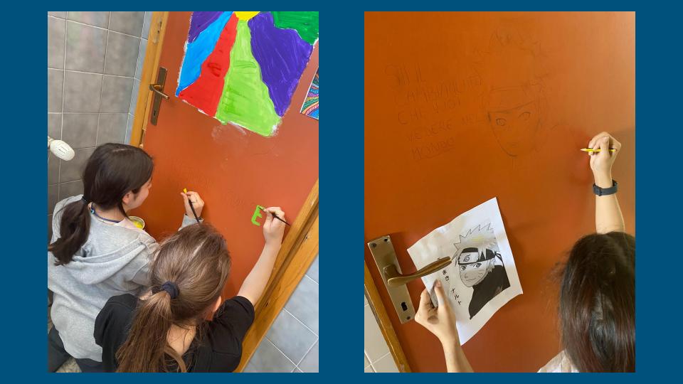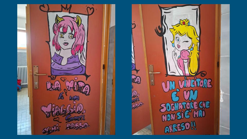 Il gruppo di alunni che ha partecipato, ha lavorato con grande entusiasmo e portato bellezza realizzando immagini tratte dai disegni “manga” e citazioni dei Grandi Umanisti del Mondo, sulle porte degli spazi degli ambienti comuni.