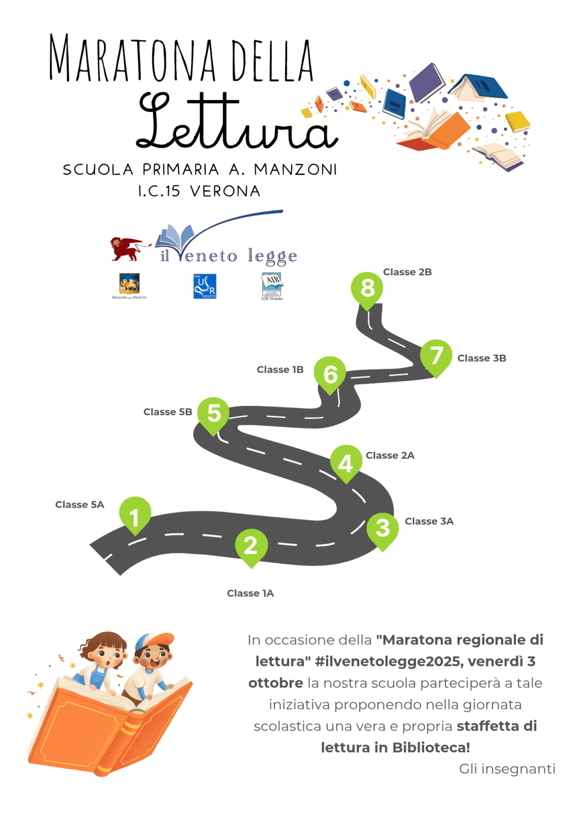 La Scuola Primaria Manzoni aderisce alla Maratona regionale di lettura: Venerdì 3 Ottobre, presso la Biblioteca Comunale Arnoldo Mondadori, le classi quarte leggeranno ad alta voce fiabe e racconti del territorio Veneto. E le altre otto classi? Be’, si avvicenderanno per tutta la giornata in emozionanti letture nella nostra Biblioteca scolastica.